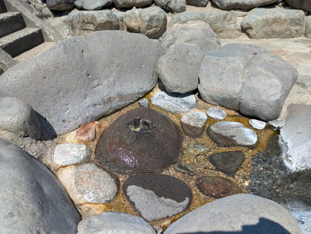 熱くなっている石に座って熱せられているお尻と、上空から照りつける日光と、お湯に浸かっている足のトリプルの熱さの中、明るすぎて見えにくいスマホ画面をダークモードに切り替えながら飲める温泉を調べました。