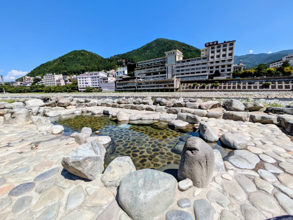 着いてみると、足湯にするには勿体ないほど広く、川を挟んだ向かいに昭和感溢れる温泉旅館が連なっており、ノスタルジックだけど青空をバックに晴れやかな気持ちになり癒されます。