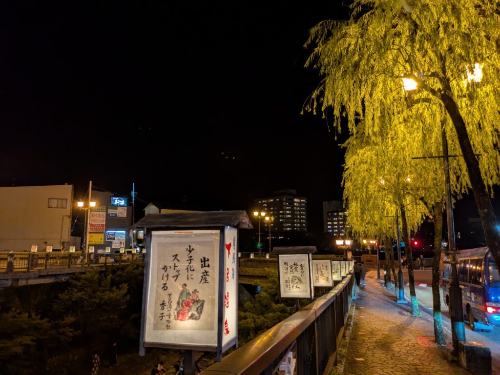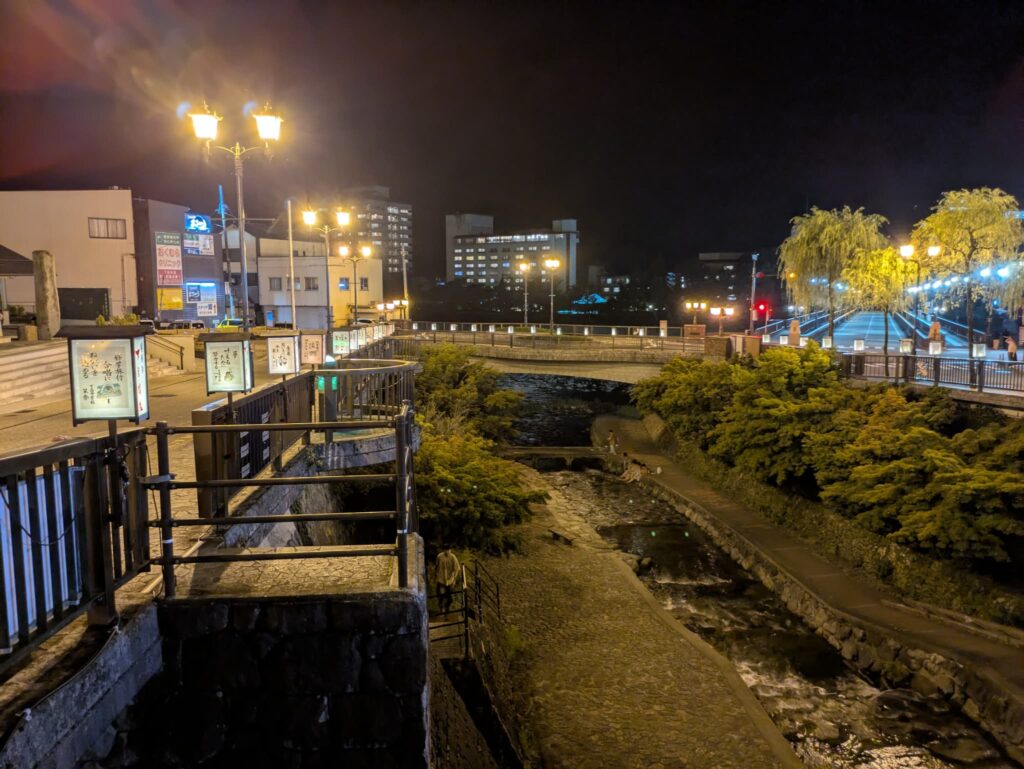 温泉街の中心に川があり、川沿いの道は、街灯でライトアップされた「しだれ柳」と沢山の灯篭がコラボして『古き良き日本』の雰囲気があり、とても美しかったです