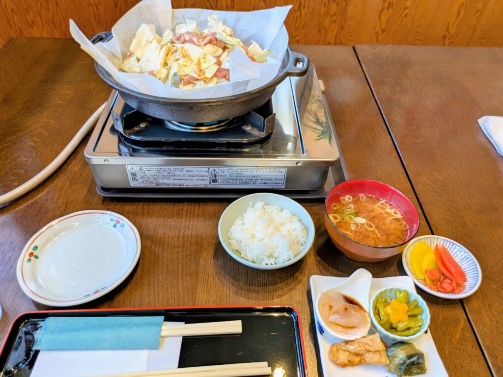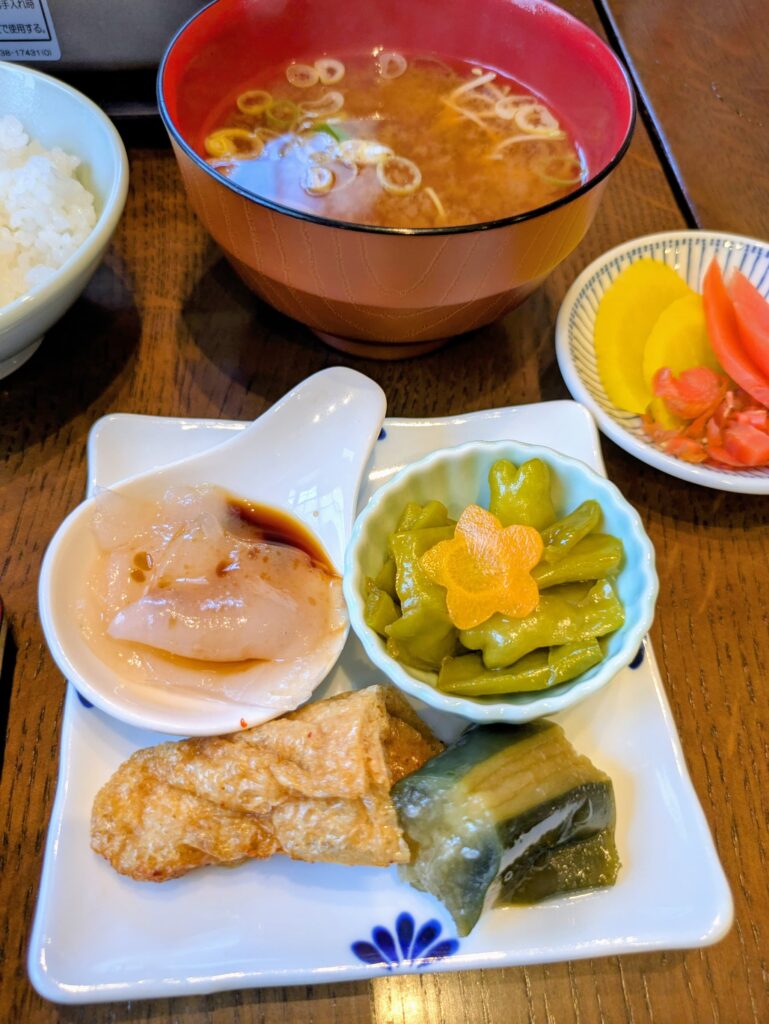 最後は焼きそばで〆たいからな…と思いつつも、運転でお酒が飲めないので「味の濃い鶏ちゃんを食すにはご飯が必要だろう」と定食にしたところ、郷土料理らしい「下呂のさしみこんにゃく」などのちょっとしたおかず盛り合わせが付いてきて、それが全てバカに出来ない旨さ。